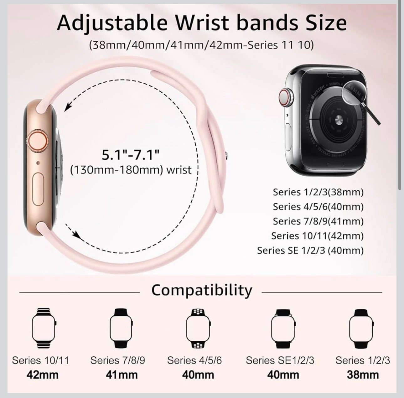 Compatible con Apple Watch Series 1, 2, 3, 4, 5, 6, 7, 8, 9, 10, 11, SE y Ultra en tamaños 38mm, 40mm, 41mm, 42mm, 44mm, 45mm, 46mm y 49mm.
